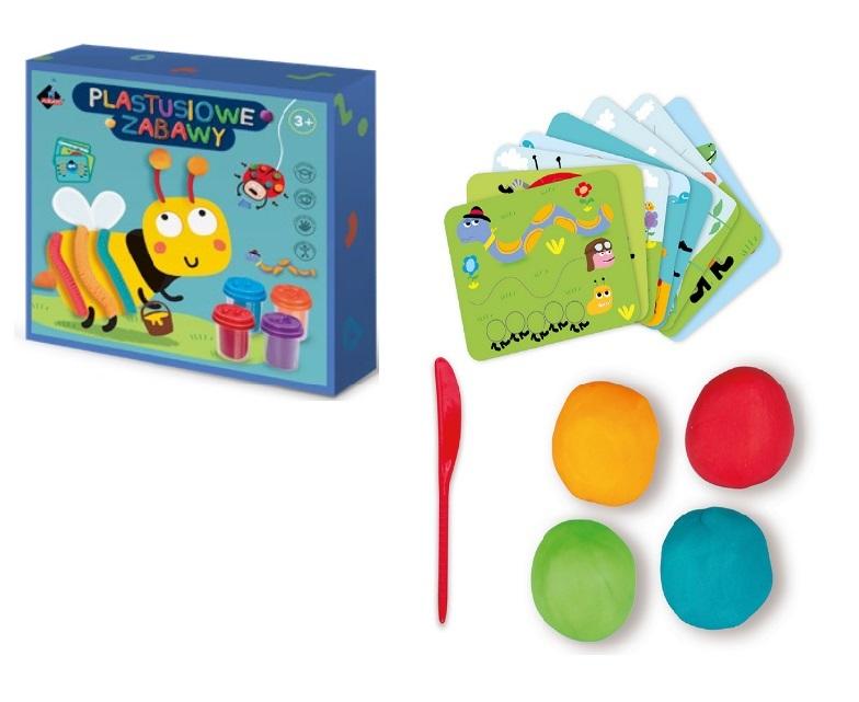 Zabawa masą plastyczną pobudza wyobraźnię i kreatywność jak również poprawia koordynację wzrokowo-ruchową. Ugniatanie i formowanie "ciasta" rozwija zdolności motoryczne dziecka, tak przydatne podczas pisania czy rysowania, a szczypanie, ściskanie oraz wałkowanie masy stymuluje zmysł dotyku. W zestawie: 8 obrazków, 4 kolory masy plastycznej (4x55g), nożyk, kolorowa książeczka z pomysłami wykonania.