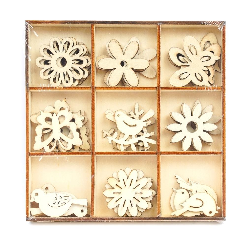 45 drewnianych dekoracji w pudełku, rozmiar dekoracji ok. 2,5 - 3,5 cm