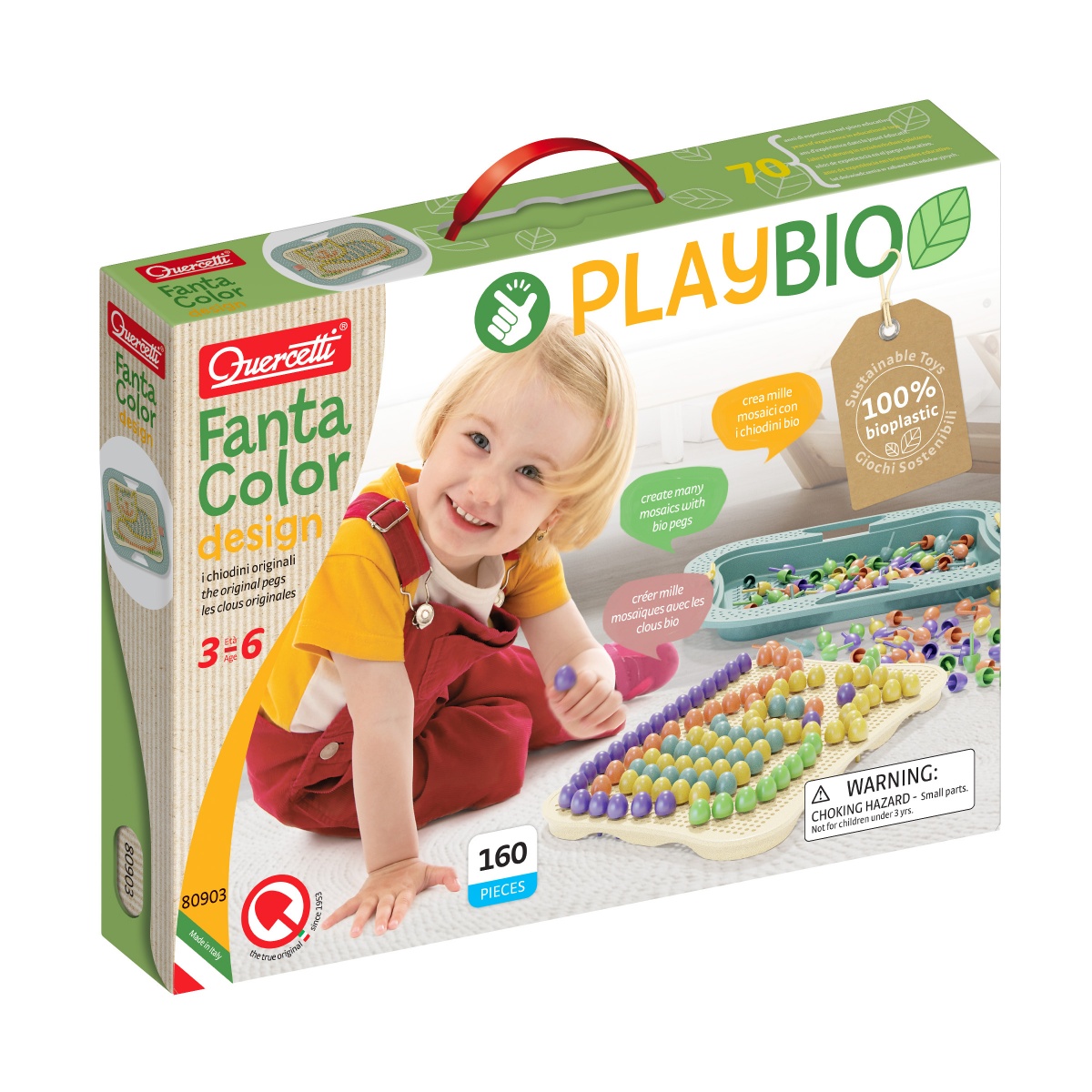 Fantacolor to ponadczasowa gra konstrukcyjna, która angażuje dzieci od pokoleń. Poprzez wkładanie kołeczków na podstawkę, dzieci mogą dowolnie wyrażać swoją kreatywność podczas ćwiczenia koordynacji oko-ręką. Zabawka umożliwia tworzenie nieskończonej liczby kompozycji, które zapewnią całkowicie bezpieczną zabawę na wiele godzin. Podstawka nie posiada ostrych krawędzi i umożliwia przechowywanie wszystkich elementów po skończonej zabawie. Playbio to nowa seria produktów ekologicznych włoskiego producenta Quercetti. Produkty przygotowane są z kompozytu biologicznego pochodzącego z włókien drewnianych i specjalnego plastiku. Drewniane włókna, które zwykle są utylizowane jako odpady pochodzą z tartaków, które posiadają odpowiednie certyfikaty środowiskowe. Większa zawartość drewna pozwala o zredukowanie ilości dwutlenku węgla niezbędnej przy produkcji aż o 80%. Po użyciu, zabawka może być 100% poddana recyklingowi.