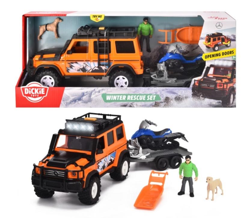 Duży pojazd z figurkami, przyczepą ze skuterem śniżynym oraz akcesoriami.