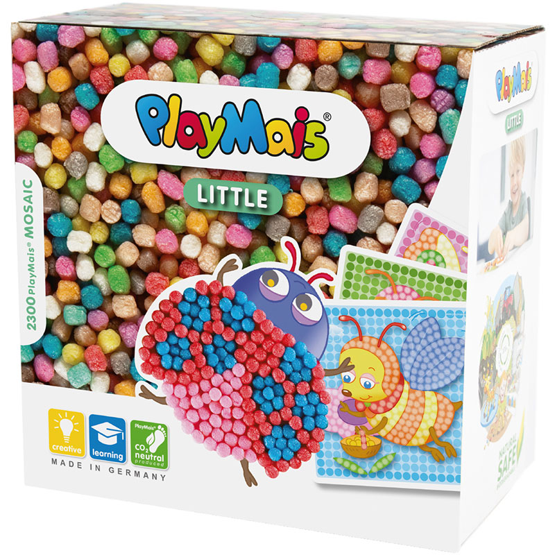 PlayMais MOSAIC LITTLE to klocki w postaci chrupek ze skrobi kukurydzianej, które można łączyć ze sobą za pomocą niewielkiej ilości wody. W zestawie znajdziemy 6 kart do naklejania, na których możemy tworzyć piękne mozaiki związane z owadami i nie tylko.