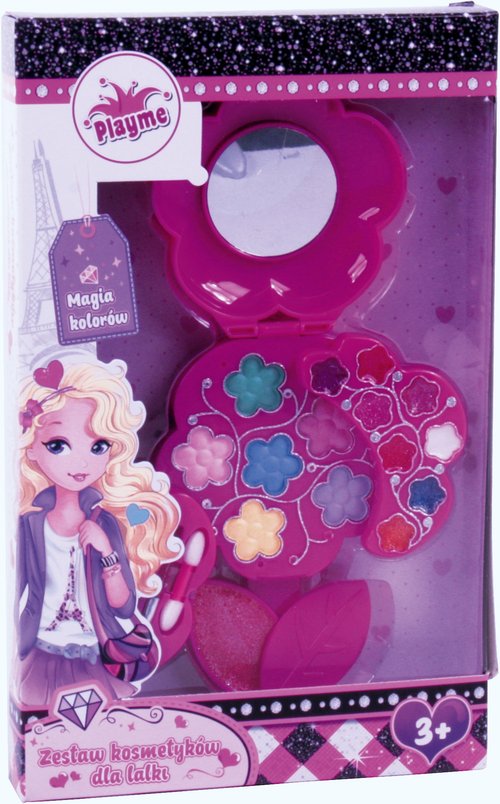 PLAYME - Zestaw kosmetyków dla lalek w kształcie muszelki Zestaw zawiera: lusterko, 6 cieni, 9 błyszczyków oraz dwa pędzelki. Bezpieczna zabawka testowana laboratoryjnie. Zabawka przeznaczona dla dzieci powyżej 3 roku życia.
