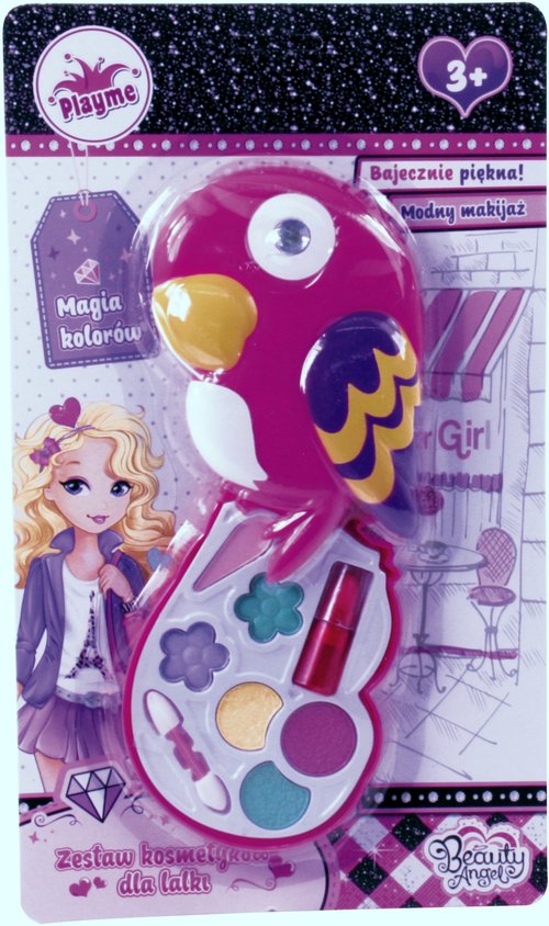 PLAYME - Zestaw kosmetyków dla lalek w kształcie papugi. Zestaw zawiera: 6 cieni, pomadkę oraz pędzelek. Bezpieczna zabawka testowana laboratoryjnie. Zabawka przeznaczona dla dzieci powyżej 3 roku życia.