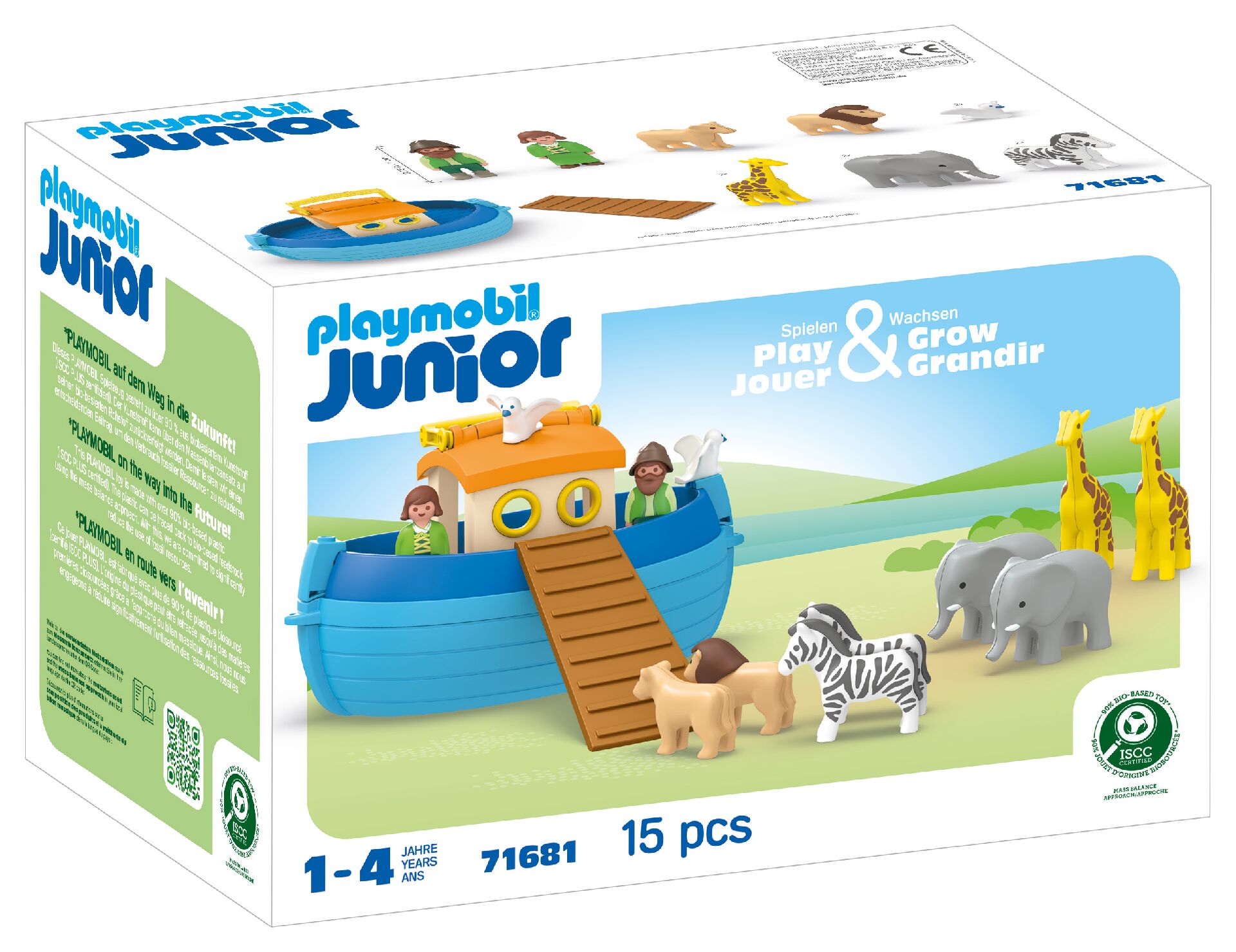 Wszystkie zestawy PLAYMOBIL JUNIOR są wykonane w ponad 90% z tworzyw sztucznych na bazie roślin, które można monitorować w materiałach pozostałych po produkcji żywności lub papieru, przyjmując system bilansu masy, stosowany w gospodarce o obiegu zamkniętym i zgodnie ze standardem ISCC PLUS. W ten sposób przyczyniamy się do zmniejszenia zużycia zasobów naturalnych.