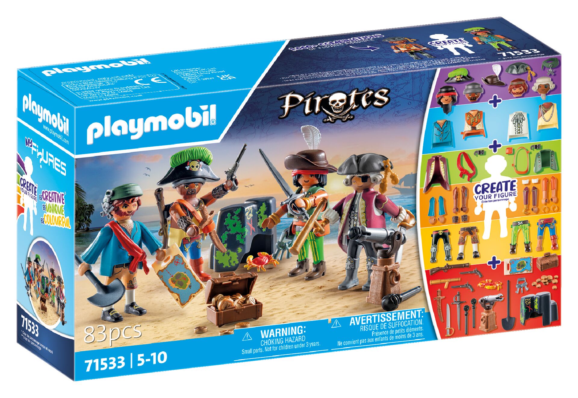 Puść wodze fantazji z zestawem My Figures: Piraci PLAYMOBIL. Zapewnia nieograniczone możliwości odgrywania ról i zabawę figurkami piratów, które można łączyć według własnego pomysłu. Z możliwością dowolnego konfigurowania i zmiany elementów takich jak głowy, korpusy, ręce i nogi. Zabawa tak kolorowa jak życie - z niezliczoną możliwością konfiguracji figurek. Ponadto zestawy z serii My Figures można łączyć ze wszystkimi częściami figurek z saszetek-niespodzianek PLAYMOBIL Figures.