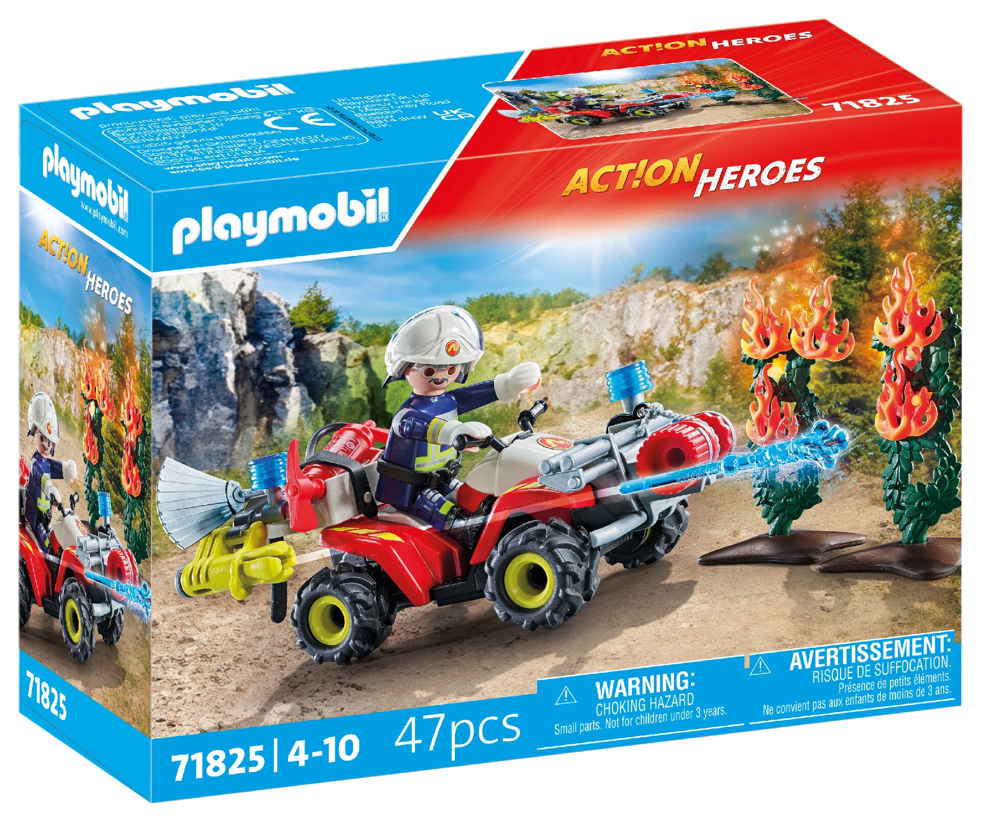 Strażak, wyposażony w profesjonalny sprzęt i akcesoria, dociera na miejsce akcji quadem z wyciągarką linową oraz armatką wodną z funkcją strzelania. Dzięki ruchomym elementommożliwości mocowania płomieni do roślinności i bogatemu zestawowi narzędzi, dzieci mogą tworzyć własne realistyczne scenariusze ratunkowe.