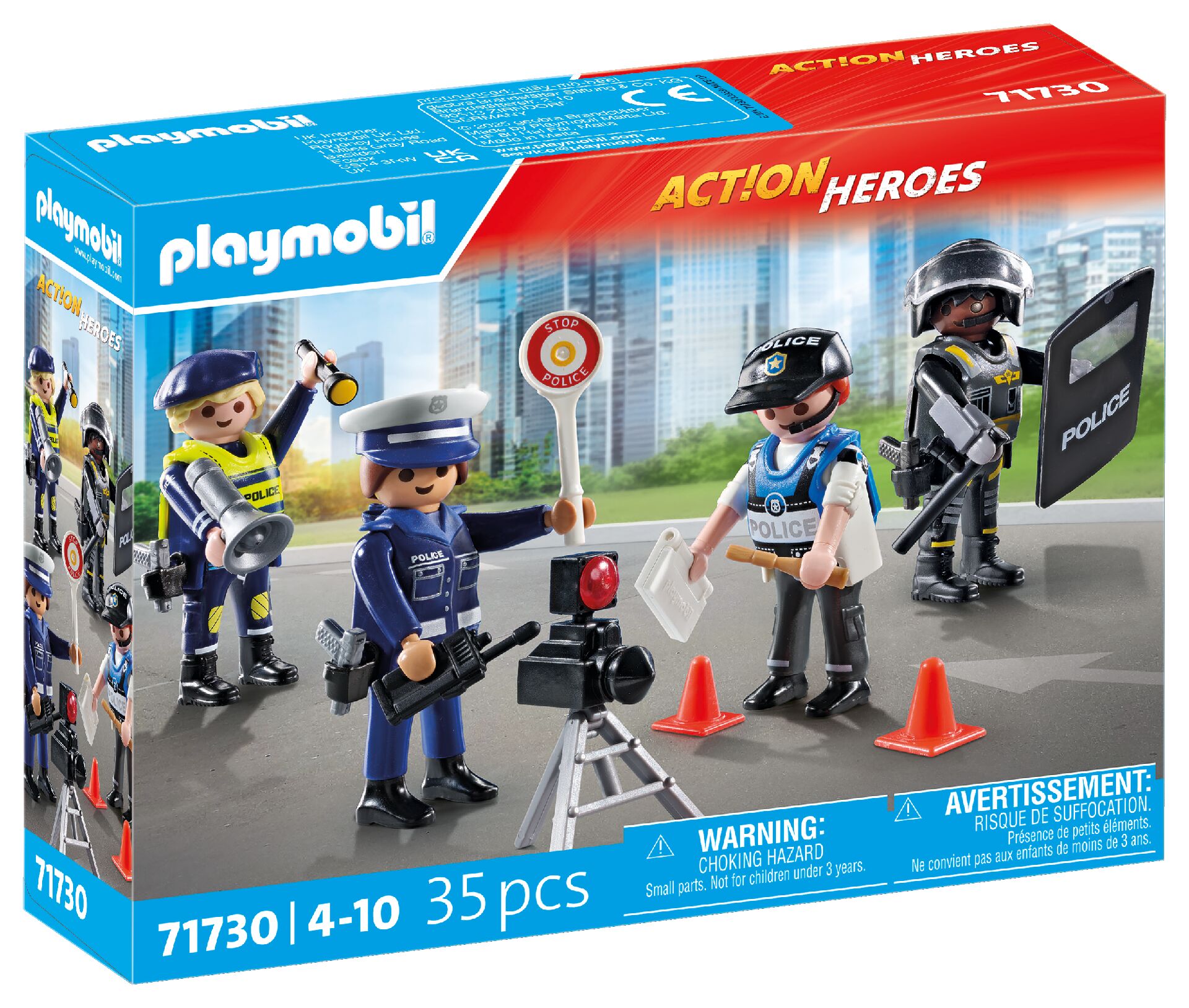 Zanurz się w pełne akcji policyjne przygody z tym wyjątkowym zestawem figurek policjantów PLAYMOBIL! Dzięki czterem funkcjonariuszom i wielu realistycznym akcesoriom, takim jak kabury, megafon i tarcza policyjna, możliwości pomysłowej zabawy będą nieograniczone. Stwórz swoim funkcjonariuszom niesamowite misje i kryminalne zagadki używając dołączonych akcesorii, takich jak migacz radarowy i latarka.