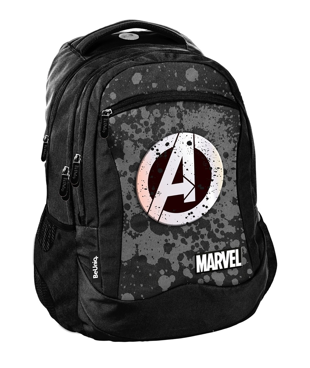 Plecak młodzieżowy BeUniq Avengers jest wyposażony w trzy pojemne komory, kieszeń przednią z organizerem zamykaną na zamek. Posiada dwie boczne kieszenie z siatki i materiału, które nadają się do przenoszenia butelki, bidonu lub termosu. W komorze głównej znajduje się przegroda – na laptop, w drugiej komorze organizer z kieszenią na zamek oraz uchwyt na klucze. Wzmocnione profilowane plecy oraz miękkie, regulowane szelki sprawiają, że plecak nosi się niezwykle komfortowo. Plecak wykonany jest z wodoodpornego materiału, dzięki czemu model ten doskonale znosi różne warunki atmosferyczne. Posiada wygodny uchwyt do przenoszenia, uszko do powieszenia oraz elementy odblaskowe dla zwiększenia bezpieczeństwa na drodze lub po zmroku.