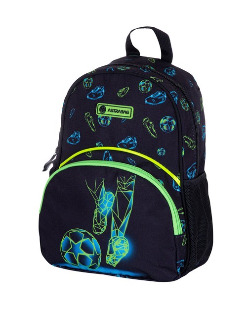 Jednokomorowy plecak Astrabag to gratka dla wszystkich fanów piłki nożnej. Pełna dynamiki geometryczna grafika przedstawiająca piłkarza chwilę przed kopnięciem piłki oraz liczne piktogramy przykuwają uwagę każdego miłośnika tej najpopularniejszej dyscypliny sportowej. Jedna pojemna komora pomieści niezbędne przedmioty każdego malucha. Natomiast dwie boczne siateczki są idealne do przechowywania butelki z wodą. Plecaczek posiada odblaskowe elementy zapewniające bezpieczeństwo. • 1 komory • 2 kieszenie zewnętrzne – siatki • metalowe uchwyty do suwaków • kolorowa, zadrukowana podszewka • miękkie szelki z regulacją długości • materiał wodoodporny • elementy odblaskowe z przodu i na szelkach