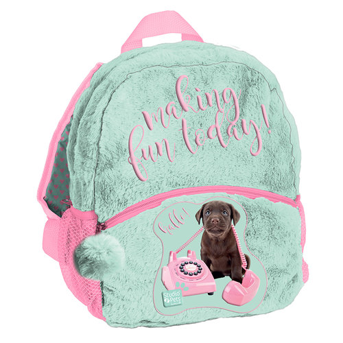 Plecak wykonany z wysokiej jakośći pluszu, dno wykonane z poliestru, jedna obszerna komora, jedna przednia kieszeń, dwie boczne kieszonki z siatki, dekoracje naszywka PVC, haft, podszewka, zadrukowane,usztywniane szelki, dodatkowo pluszowy pomponik przy jednym zamku, przy drugim wstążeczka.