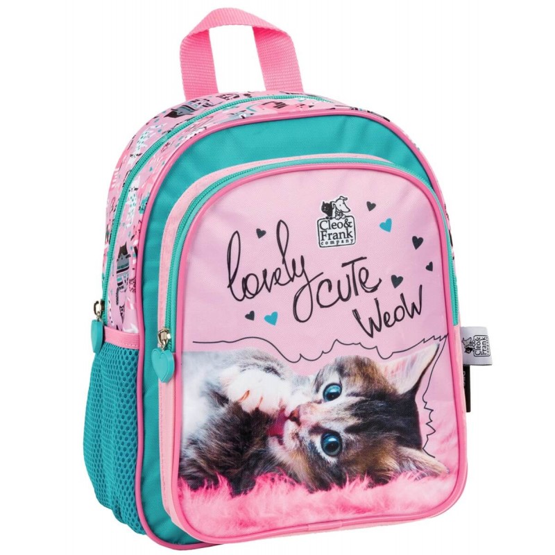 Niewielki, jednokomorowy plecaczek do przedszkola lub na wycieczkę z uroczym kotkiem z kolekcji Cleo & Frank. Modne kolory i ponadczasowy design. Przednia kieszonka na drobne przedmioty i boczna kieszeń z siateczki na bidon lub butelkę z wodą. Genialny wzór małych kotków. Ozdobne pullery przy zamkach i kwiecisty print dookoła zamka. Postaw na sprawdzone rozwiązania - zamów plecak z najnowszej kolekcji Cleo & Frank!