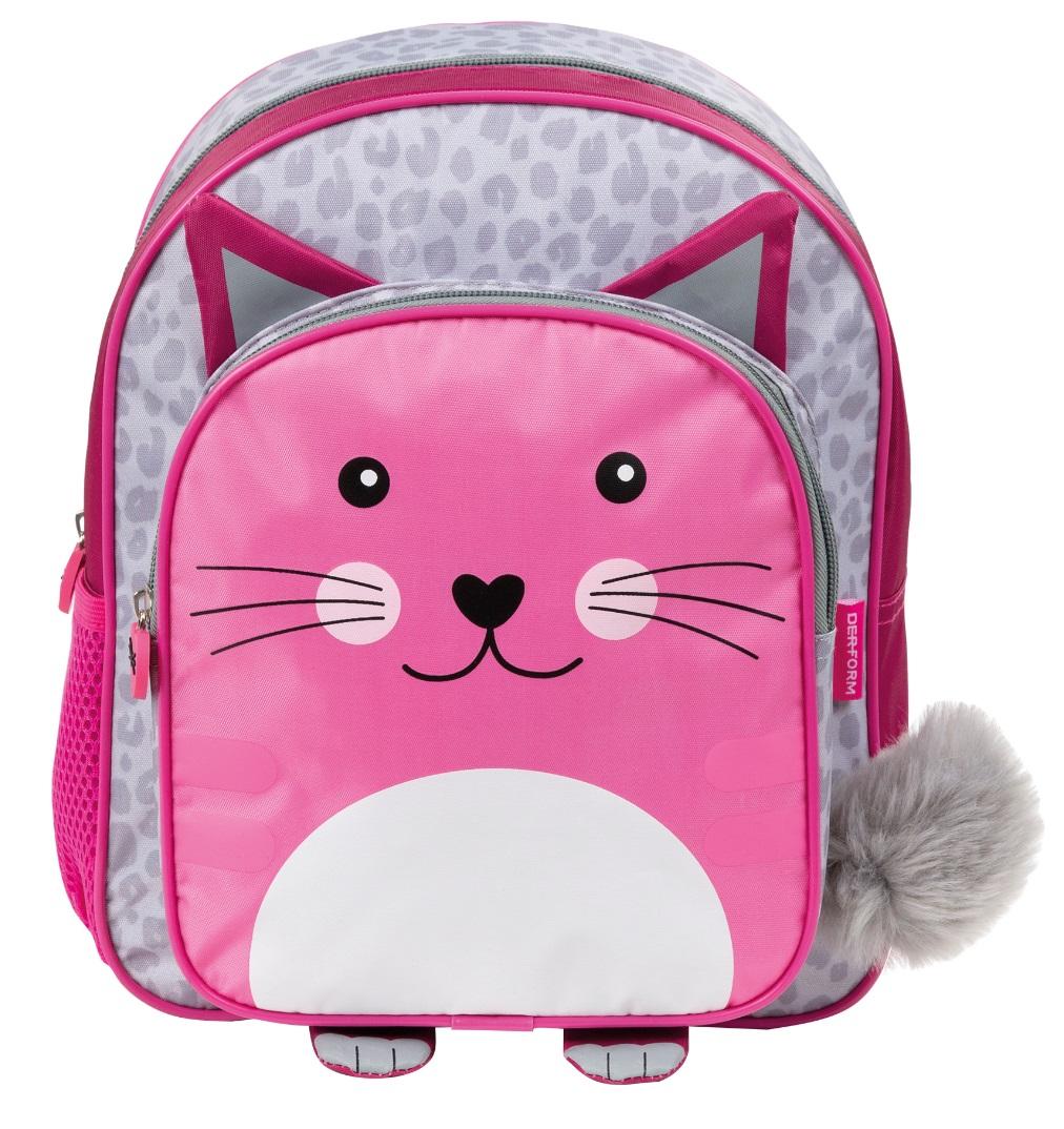 Kolorowy plecaczek z grafiką kocią. Wykonany z impregnowanej tkaniny. Plecak posiada dwie komory zapinane na zamek zakończony ozdobnym pullerem. Wnętrze plecaka wykończone jest podszewką. Długość szelek można regulować . Dodatkowo plecak posiada uchwyt do przenoszenia.