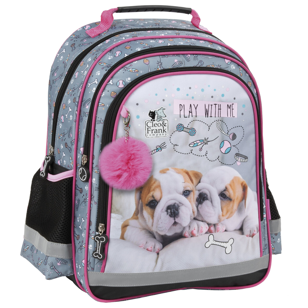 Dwukomorowy plecak szkolny z obszerną kieszenią przednią. Po bokach znajdują się dwie boczne kieszonki wykończone siatką. Plecak posiada miękkie wyściełane szelki, ergonomiczne plecy, taśmy odblaskowe, wzmacnianą rączkę oraz wzmacniane dno. Wymiary 38x28x18 cm Waga 600 g