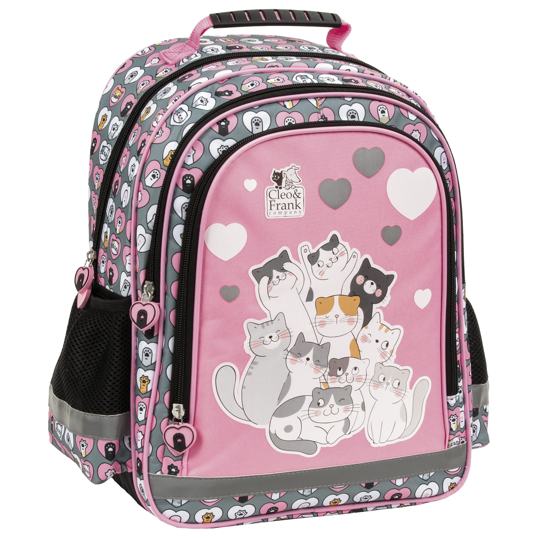 Dwukomorowy plecak szkolny z obszerną kieszenią przednią. Po bokach znajdują się dwie boczne kieszonki wykończone siatką. Plecak posiada miękkie wyściełane szelki, ergonomiczne plecy, taśmy odblaskowe, wzmacnianą rączkę oraz wzmocnione dno.