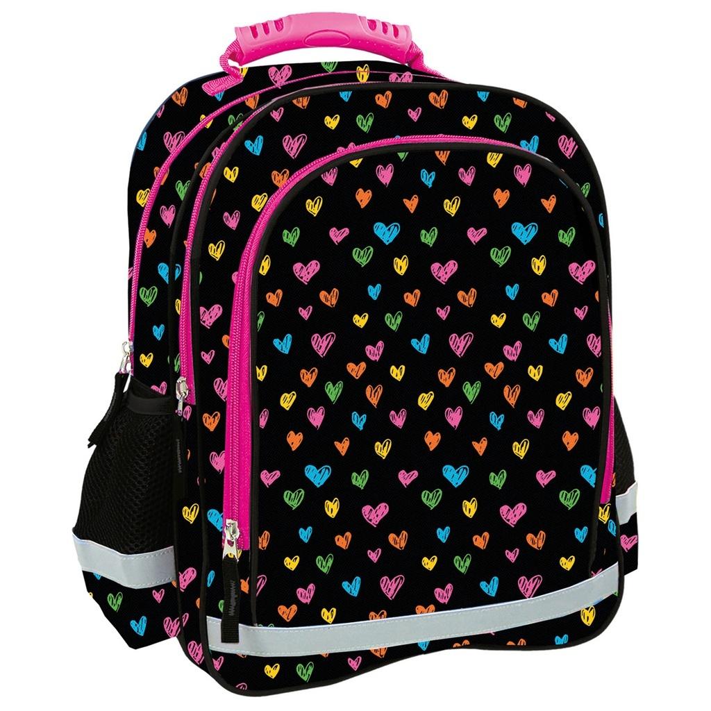 Dwukomorowy plecak szkolny z obszerną kieszenią przednią. Po bokach znajdują się dwie boczne kieszonki wykończone siatką. Plecak posiada miękkie wyściełane szelki, ergonomiczne plecy, taśmy odblaskowe, wzmacnianą rączkę oraz wzmacniane dno.
