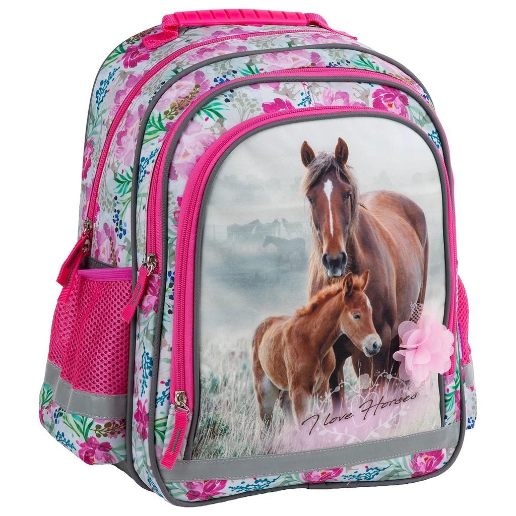 Dwukomorowy plecak szkolny z obszerną kieszenią przednią. Po bokach znajdują się dwie boczne kieszonki wykończone siatką. Plecak posiada miękkie wyściełane szelki, ergonomiczne plecy, taśmy odblaskowe, wzmacnianą rączkę oraz wzmacniane dno.