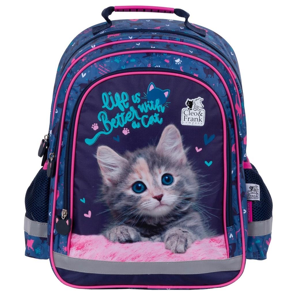 Dwukomorowy plecak szkolny z obszerną kieszenią przednią. Po bokach znajdują się dwie boczne kieszonki wykończone siatką. Plecak posiada miękkie wyściełane szelki, ergonomiczne plecy, taśmy odblaskowe, wzmacnianą rączkę oraz wzmocnione dno.