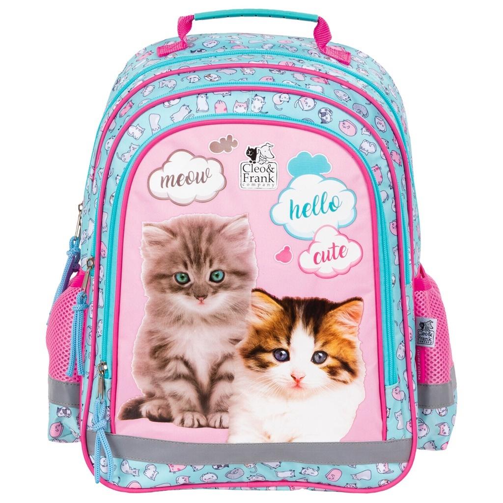 Dwukomorowy plecak szkolny z obszerną kieszenią przednią. Po bokach znajdują się dwie boczne kieszonki wykończone siatką. Plecak posiada miękkie wyściełane szelki, ergonomiczne plecy, taśmy odblaskowe, wzmacnianą rączkę oraz wzmocnione dno.