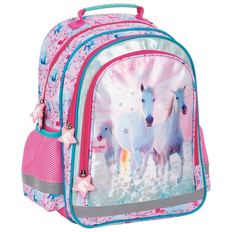 Dwukomorowy plecak szkolny z obszerną kieszenią przednią. Po bokach znajdują się dwie boczne kieszonki wykończone siatką. Plecak posiada miękkie wyściełane szelki, ergonomiczne plecy, taśmy odblaskowe, wzmacnianą rączkę oraz wzmocnione dno.