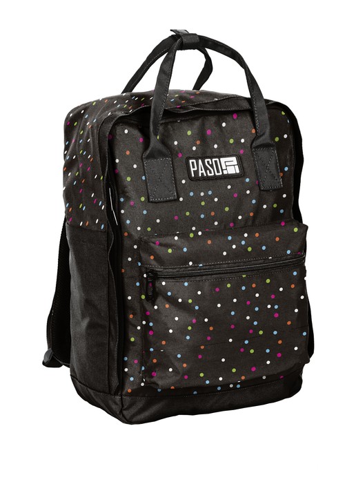 Plecak młodzieżowy, jedna komora główna z kieszenią na laptop, kieszeń przednia. Dwie kieszenie boczne, kieszeń na plecach na dokumenty. Regulowane, wyściełane siatką szelki. Dwa uchwyty do noszenia.