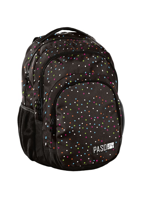 Plecak młodzieżowy, szkolny. Dwie pojemne komory, kieszeń przednia z organizerem, 2 boczne kieszenie z siatki. Wzmocnione profilowane plecy evafoam miękkie wygodne szelki. Wygodny uchwyt do przenoszenia i uszko do powieszenia. W komorze głównej przegroda (na laptop), w drugiej komorze organizer z kieszenią na zamek, uchwyt na klucze. Elementy odblaskowe dla większego bezpieczeństwa.