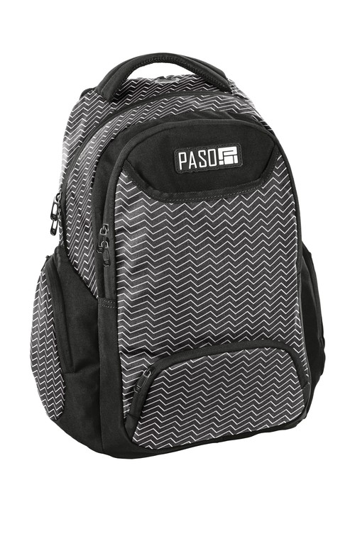 Plecak młodzieżowy, szkolny. Dwie pojemne komory, kieszeń przednia, 2 boczne kieszenie zapinane na zamek. Wzmocnione profilowane plecy, miękkie wygodne szelki. Wygodny uchwyt do przenoszenia i uszko do powieszenia. W komorze głównej przegroda (na laptop), w drugiej komorze organizer z kieszenią na zamek, uchwyt na klucze. Elementy odblaskowe dla większego bezpieczeństwa.