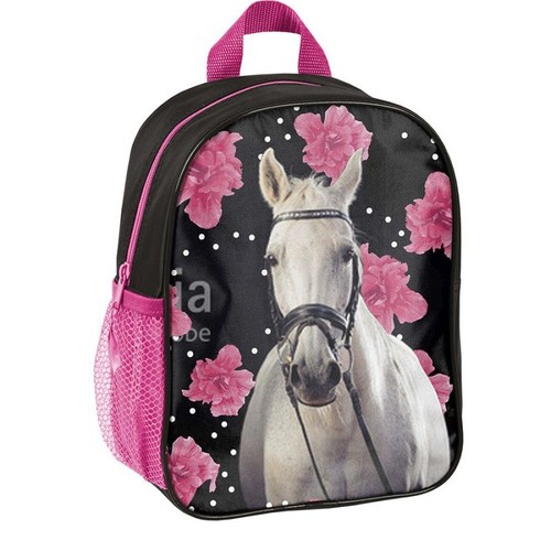 Mały plecak przedszkolny, jedna komora, jedna boczna kieszeń z siatki (mieści małą butelkę, bidon lub termos). Regulowane szelki, wygodny uchwyt do przenoszenia.