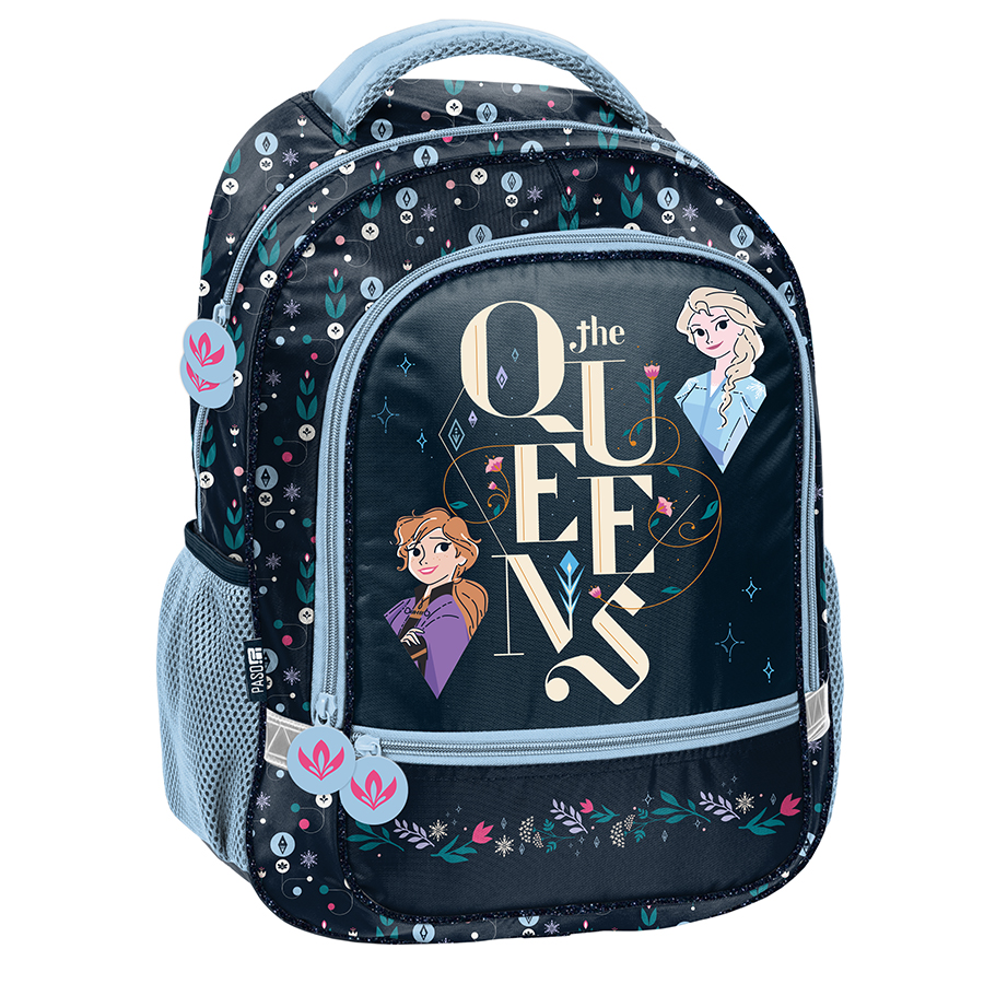 Plecak szkolny Frozen. Produkt składa się z dwóch dużych komór, kieszeni na froncie oraz z dwóch bocznych kieszonek wykonanych z siatki.