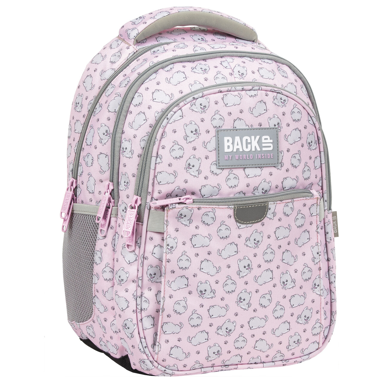 Pastelowy róż w połączeniu z szarymi detalami i urokliwymi, niezdarnymi pieskami - czy można wymarzyć sobie lepszy plecak dla dziewczynki? Niesforne, białe psiaki prezentują przeróżne sztuczki, które wywołają uśmiech na dziecięcej twarzy. Taki futrzany przyjaciel to skarb, zwłaszcza w pierwsze dni szkoły! Rozmiar plecaka BackUP z kolekcji Boo, oraz jego wyjątkowy wzór zostały dopasowane z myślą o dzieciach, które dopiero rozpoczynają swoją szkolną przygodę. Plecak BackUP posiada: - 3 komory - 2 boczne kieszenie na bidon - na froncie plecaka poszerzoną kieszeń na zamek, która może pomieścić nawet małą śniadaniówkę - w pierwszej komorze dwie dodatkowe przegródki, dzięki którym łatwiej zachować porządek - w przedniej komorze kieszonkę z siateczki na zamek błyskawiczny, uchwyt na klucze, przegródki na długopisy, legitymację oraz większą kieszeń na chusteczki, płyn antybakteryjny, czy gumy do żucia - ergonomiczne, usztywnione plecy wyprofilowane oddychającą pianką - miękkie, profilowane szelki z możliwością regulacji - czarne dno wykonane ze wzmocnionej tkaniny - wzmocnioną rączkę do przenoszenia oraz dodatkowy uchwyt do powieszenia plecaka - odblaski na froncie oraz na szelkach - rozmiar 39x27x20 cm