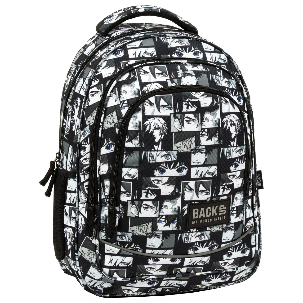 "Dynamiczne eksplozje i charakterystyczni bohaterowie na czarno-białym, komiksowym tle tworzą wyjątkowy plecak dla miłośników japońskiej Mangi. Niebieski odcień oczu postaci dodaje im tajemniczej głębi, a ich spojrzenia pobudzają wyobraźnię do stworzenia jedynej w swoim rodzaju historii. Plecak BackUP posiada: - 3 komory - 2 boczne kieszenie na bidon - w pierwszej komorze kieszenie do przechowywania laptopa i tabletu - w przedniej komorze kieszonkę z siateczki na zamek błyskawiczny, uchwyt na klucze, przegródki na długopisy, legitymację oraz większą kieszeń na chusteczki, płyn antybakteryjny, czy gumy do żucia - ergonomiczne, usztywnione plecy wyprofilowane oddychającą pianką - miękkie, profilowane szelki z możliwością regulacji - czarne dno wykonane ze wzmocnionej tkaniny - wzmocnioną rączkę do przenoszenia oraz dodatkowy uchwyt do powieszenia plecaka - odblaski na froncie oraz na szelkach - rozmiar 42x30x20 cm - nazwa kolekcji:"