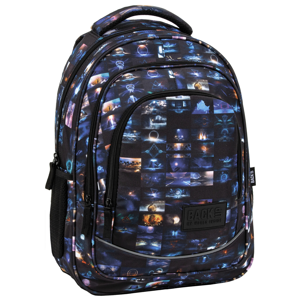 "Tajemnicze miejsca, silne żywioły, nadprzyrodzone zjawiska, niezwykłe stworzenia. Fantastyczne ikony składają się na mistyczny i pełen magii plecak BackUP. Kompozycja stworzona z połączenia graficznych kafelków przedstawiających miejsca z sennych marzeń sprawia, że ten pełen tajemnic plecak szkolny wciąga w nieskończoną głębie wyobraźni. Plecak BackUP posiada: - 3 komory - 2 boczne kieszenie na bidon - w pierwszej komorze kieszenie do przechowywania laptopa i tabletu - w przedniej komorze kieszonkę z siateczki na zamek błyskawiczny, uchwyt na klucze, przegródki na długopisy, legitymację oraz większą kieszeń na chusteczki, płyn antybakteryjny, czy gumy do żucia - ergonomiczne, usztywnione plecy wyprofilowane oddychającą pianką - miękkie, profilowane szelki z możliwością regulacji - czarne dno wykonane ze wzmocnionej tkaniny - wzmocnioną rączkę do przenoszenia oraz dodatkowy uchwyt do powieszenia plecaka - odblaski na froncie oraz na szelkach - rozmiar 42x30x20 cm - nazwa kolekcji:"