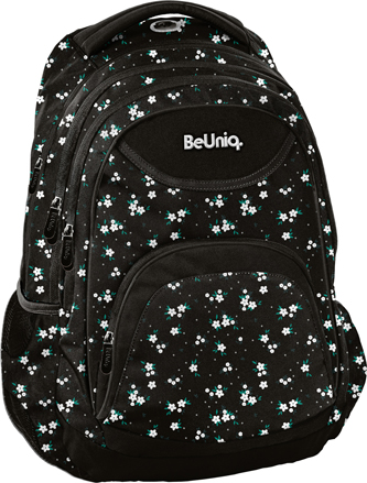 Plecak młodzieżowy Flowers BeUniq . Posiada trzy pojemne komory, kieszeń przednią z organizerem zamykaną na zamek oraz dwie boczne kieszonki, wykonane z siatki i materiału, które pomieszczą butelkę, bidon czy termos. W komorze głównej, znajduje się przegroda (na laptop). W drugiej komorze organizer z kieszenią na zamek oraz uchwyt na klucze. Wzmocnione profilowane plecy oraz miękkie, regulowane szelki sprawią, że plecak nosi się niezwykle komfortowo. Plecak posiada wygodny uchwyt do przenoszenia, uszko do powieszenia oraz elementy odblaskowe dla większego bezpieczeństwa na drodze po zmroku. Model zawiera usztywniony i wzmocniony spód. Ze względu na swój rozmiar, plecak ten to idealne rozwiązanie dla nastolatków, jak i dla młodszych dzieci.
