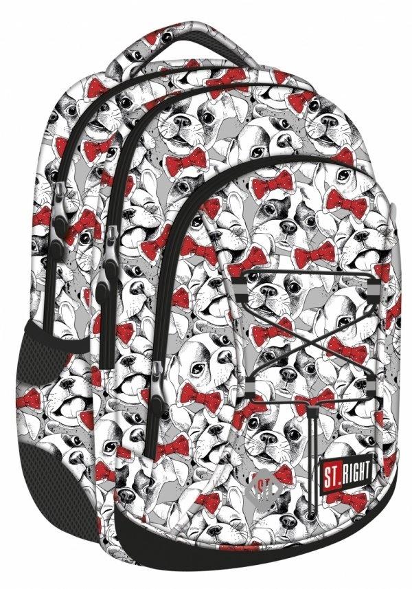 Pojemny i funkcjonalny plecak szkolny przypadnie do gustu każdemu. Plecak charakteryzuje bardzo staranne wykonanie oraz ciekawy wzór w słodkie psiaki. Materiał z którego plecak uszyto jest wodoodporny i wytrzymały. Plecak jest bardzo pojemny, posiada 3 duże komory. Główna komora posiada kieszeń na laptop oraz małą kieszonkę na zamek wyściełaną polarem z miejscem na podpis. Druga komora posiada dużą kieszeń na zamek a kieszeń frontowa ma praktyczny organizer z przywieszką na klucze. Ponadto, kieszeń jest wzmocniona grubą pianką, która chroni przed ewentualnymi uszkodzeniami. Po bokach plecak posiada dwie otwarte kieszenie na butelkę wody lub bidon. Wszystkie suwaki zakończone są dużymi poręcznymi pullerami. Tył plecaka jest mocno usztywniony, ergonomiczny i pokryty oddychającym materiałem. Szelki są szerokie, miękko wyściełane z wygodną regulacją długości. Spód plecaka wzmocniony jest grubą pianką. U góry plecak ma wszyty miękko wyściełany, wzmocniony uchwyt do przenoszenia.
