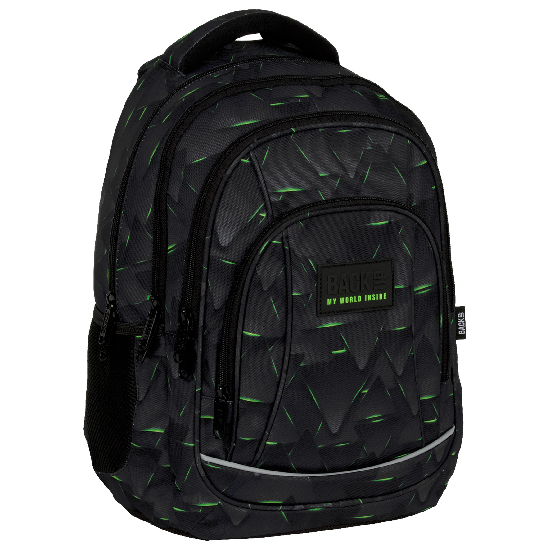 Trójkątne kształty w odcieniach grafitu i czerni, spod których krawędzi wyłania się łuna cybernetycznej, świetlistej zieleni. Ciemne dodaki w postaci suwaków i zamków dodają elegancji. Minimalistyczny a zarazem przyciągający wzrok. To plecak młodzieżowy dla tych, dla których w modzie liczą się detale. Plecak BackUP posiada: - 4 komory - 2 boczne kieszenie na bidon - w pierwszej komorze kieszenie do przechowywania laptopa i tabletu - w drugiej komorze małą kieszonkę na zamek błyskawiczny, idealną na drobiazgi - w trzeciej komorze kieszonkę z siateczki na zamek błyskawiczny, uchwyt na klucze, przegródki na długopisy, legitymację oraz większą kieszeń na chusteczki, płyn antybakteryjny, czy gumy do żucia - ergonomiczne, usztywnione plecy wyprofilowane oddychającą pianką - miękkie, profilowane szelki z możliwością regulacji - regulowany pasek mostka - czarne dno wykonane ze wzmocnionej tkaniny - odblaski na froncie oraz szelkach - rozmiar 42x30x20 cm Nazwa kolekcji: Cyber Triangles