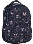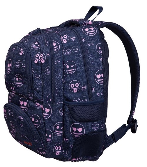 Pojemny i funkcjonalny plecak charakteryzuje bardzo staranne wykonanie oraz ciekawy wzór z emotkami. Materiał z którego plecak uszyto jest wodoodporny i wytrzymały. Plecak jest bardzo pojemny, posiada 4 komory. W pierwszej komorze znajduje się duża zakładka na format A4 oraz wyściełana kieszeń na smartfona z miejscem na podpis; druga pojemna komora również swobodnie mieści format A4, posiada poręczny organizer z zawieszką na klucze oraz dużą kieszeń na zamek; trzecia komora wzmocniona jest dodatkowo pianką, która nie pozwoli na ewentualne uszkodzenia, czwarta komora jest kieszenią termiczną z atestem PZH. Po bokach plecak posiada dwie otwarte kieszenie na butelkę wody lub bidon. Dwukierunkowe suwaki dają możliwość szybkiego, wygodnego otwierania. Wszystkie suwaki zakończone są dużymi poręcznymi pullerami. Tył plecaka jest mocno usztywniony, ergonomiczny i pokryty oddychającym materiałem. Szelki są szerokie, miękko wyściełane pokryte od spodu oddychającym materiałem. Spód plecaka wzmocniony jest grubą pianką oraz posiada praktyczne stopki. U góry plecak ma wszyty miękko wyściełany, wzmocniony uchwyt do przenoszenia oraz wyjście na słuchawki. Na szekach posiada mocne odblaski. Dodatkowo ma uchwyt do suwaka głównej komory pozwalające na założenie zabezpieczenia kłódkowego lub z szyfrowaniem TSA.