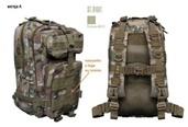Charakterystyka plecaka: 4 komory komora główna wyposażona w kieszeń siatkową i kieszeń na suwak boczne i dolne pasy kompresyjne oraz taśma spinająca plecak taśmy mocujące w systemie MOLLE oczka D-Ring 2 praktyczne organizery usztywnione gąbką plecy miękkie szelki szybkoodpinające z regulacją długości pasy naramienne pas biodrowy stabilizujący plecak i przenoszący część jego ciężaru na biodra materiał nieprzemakalny Wymiary: wysokość: 41 cm szerokość: 22 cm głębokość: 22 cm Waga: 900 g Pojemność: 25 l