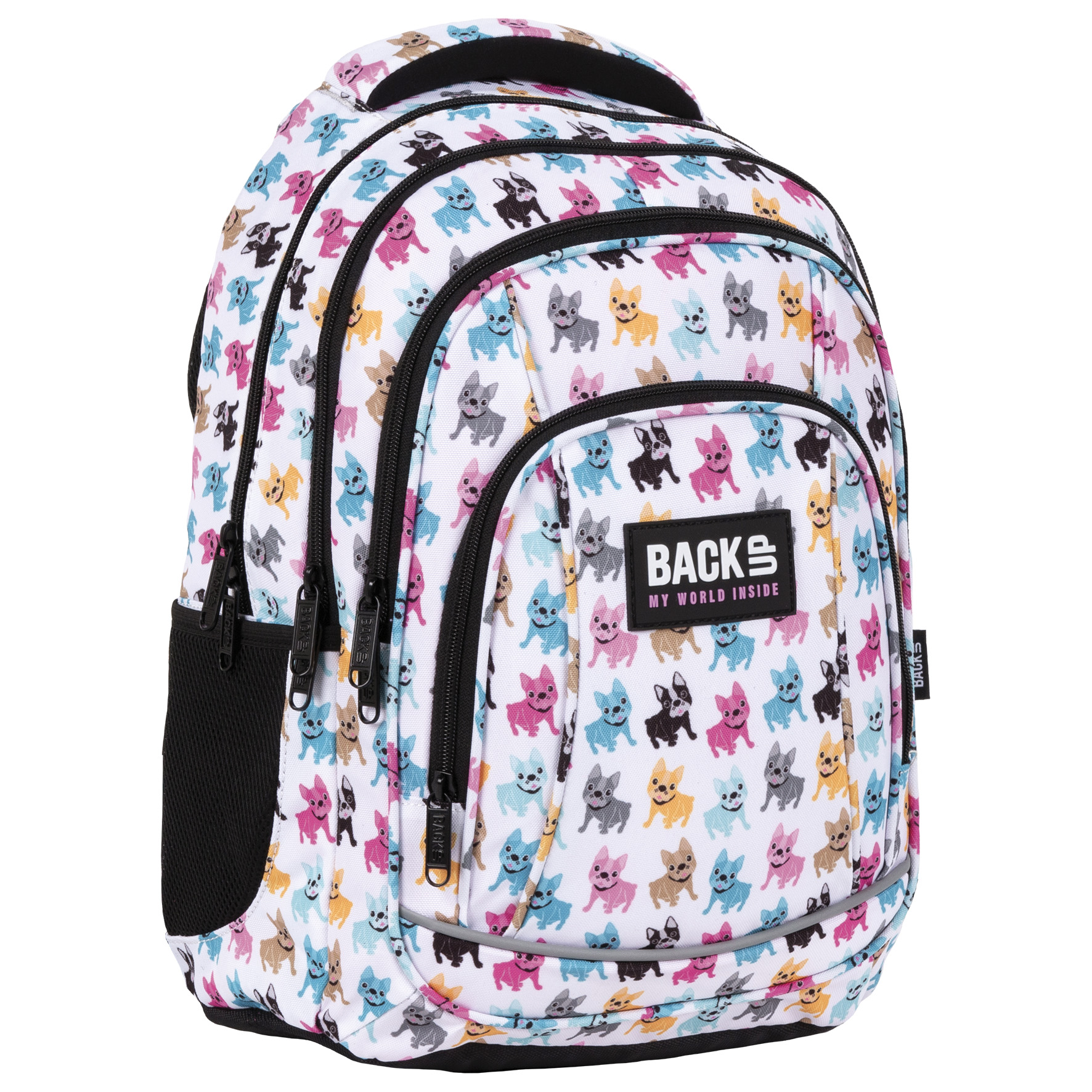 Buldożki francuskie zdominowały świat mody na długi czas. Tak brzydkie, że aż piękne, rozczulają wszystkich, którzy na nie patrzą. Ich charakterystyczne cechy zostały podkreślone intensywnymi, tęczowymi kolorami. Wielobarwne wzory idealnie współgrają z białym tłem tworząc interesującą całość. Plecak z uroczymi buldogami to strzał w dziesiątkę dla wszystkich fanów tej rasy i nie tylko! Plecak zapewni doskonały komfort noszenia oraz stanowić będzie idealne dopełnienie każdego Twojego looku.