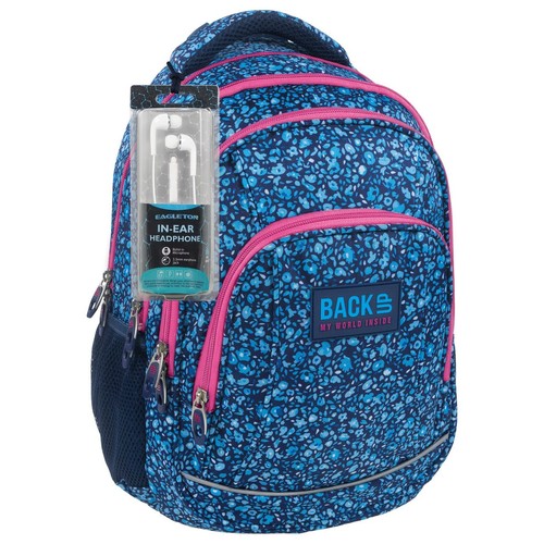 Szkolny plecak BackUP model A w drobne, niebieskie kwiatki przywodzące na myśl romantyczną wiosenną łąkę, wykończony różowymi zamkami które dopełniają całości. W zestawie słuchawki - gratis. Wyposażenie: - 4 duże komory - 2 boczne kieszenie na napój - w tylnej komorze kieszenie na laptopa i tablet - w trzeciej komorze praktyczna kieszeń na zamek na drobiazgi - w przedniej komorze poręczny organizer z kieszonką na zamek oraz odczepianym uchwytem na klucze - dno plecaka wykonane ze wzmocnionej tkaniny - miękkie, profilowane szelki - wygodny uchwyt do przenoszenia plecaka i dodatkowy uchwyt do powieszenia - ergonomiczne, usztywnione plecy wyprofilowane oddychającą pianką - dyskretny odblask w dole plecaka oraz na szelkach - rozmiar: 42x30x20 cm BackUP - My world inside Marka młodzieżowa BackUP powstała w oparciu o długoletnie doświadczenie branżowe swojego producenta firmy Derform. W najnowszej kolekcji nawiązano do najmodniejszych światowych trendów odpowiadając tym samym na potrzeby użytkowników. Plecaki tej marki charakteryzują się dbałością o każdy szczegół i troską o zdrowie użytkowników. Uzupełnieniem kolekcji plecaków jest szeroka gama piórników, worków na plecy, kosmetyczkę, toreb fitness oraz toreb sportowych.