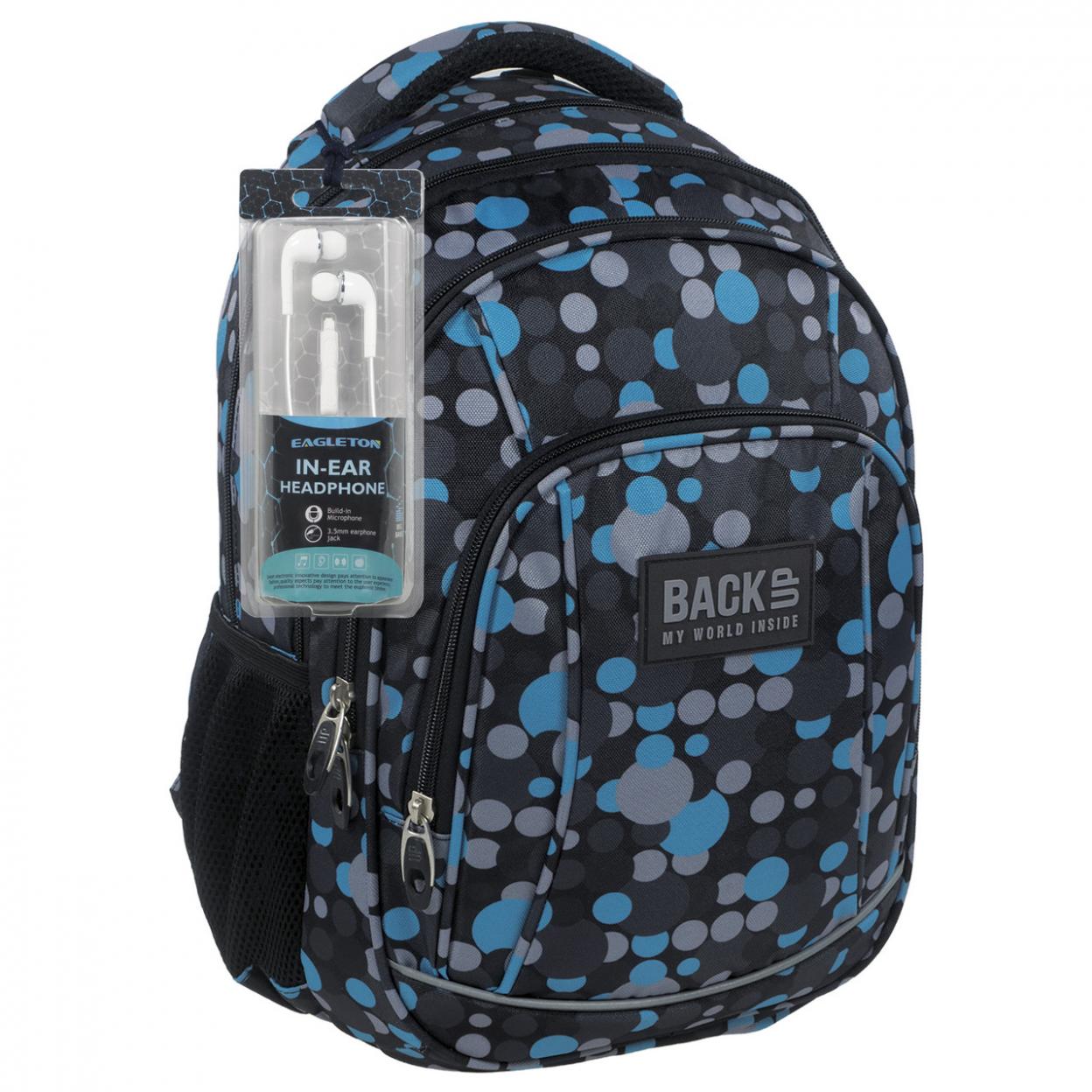 Szkolny plecak BackUP model A w stonowanych kolorach czerni i błękitu wykończony szarością. W zestawie słuchawki - gratis. Wyposażenie: - 4 duże komory - 2 boczne kieszenie na napój - w tylnej komorze kieszenie na laptopa i tablet - w trzeciej komorze praktyczna kieszeń na zamek na drobiazgi - w przedniej komorze poręczny organizer z kieszonką na zamek oraz odczepianym uchwytem na klucze - dno plecaka wykonane ze wzmocnionej tkaniny - miękkie, profilowane szelki - wygodny uchwyt do przenoszenia plecaka i dodatkowy uchwyt do powieszenia - ergonomiczne, usztywnione plecy wyprofilowane oddychającą pianką - dyskretny odblask w dole plecaka oraz na szelkach