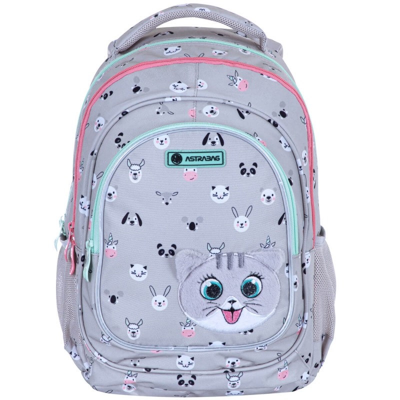 Trzykomorowy plecak Astrabag został stworzony z myślą o wszystkich miłośniczkach kotków. Na jego froncie znajduje się naszyty pluszowy pyszczek mruczka, który jest przemiły w dotyku. Dodatkowo szara kolorystyka przeplatana pastelowymi odcieniami różu i mięty skradnie serce każdej dziewczynki. Plecak wyposażony jest w trzy pojemne komory pełne praktycznych schowków. Zastosowano w nim wyjątkową technologię Ergo Back minimalizującą naciski na barki i kręgosłup oraz zapewniającą poczucie komfortu dziecka. • 3 komory • 2 kieszenie zewnętrzne – siatki • organizer z brelokiem na klucze w przedniej komorze • metalowe uchwyty do suwaków • kolorowa, zadrukowana podszewka • profilowane, ergonomiczne dodatkowo usztywnione plecy • miękkie szelki z regulacją długości • wzmocniony uchwyt • materiał wodoodporny • elementy odblaskowe • gumowe nóżki na spodzie chroniące przed przetarciami