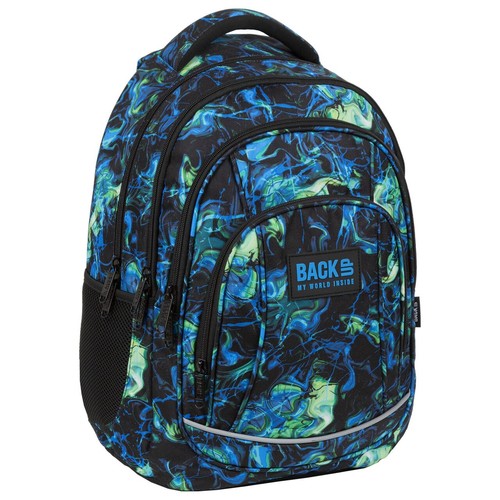 Niebieskie i zielone smugi farby, sprawiają wrażenie fluorescencyjnych przez co plecak zyskuje ultranowoczesny charakter. Wnętrze: - 4 duże komory - 2 boczne kieszenie na napój - w pierwszej komorze kieszenie na laptopa i tablet - w trzeciej komorze praktyczna kieszonka na zamek, poręczny organizer z zamykaną kieszonką z siateczki, miejscem na długopisy oraz uchwytem na klucze - pasek mostka - dno plecaka wykonane ze wzmocnionej tkaniny - miękkie, profilowane szelki - wygodny uchwyt do przenoszenia plecaka i dodatkowy uchwyt do powieszenia - ergonomiczne i profilowane, usztywnione plecy z pianki zapewniającej wentylację - lamówka z odblaskiem na froncie plecaka oraz na szelkach - rozmiar: 42x30x20 cm - waga:880g