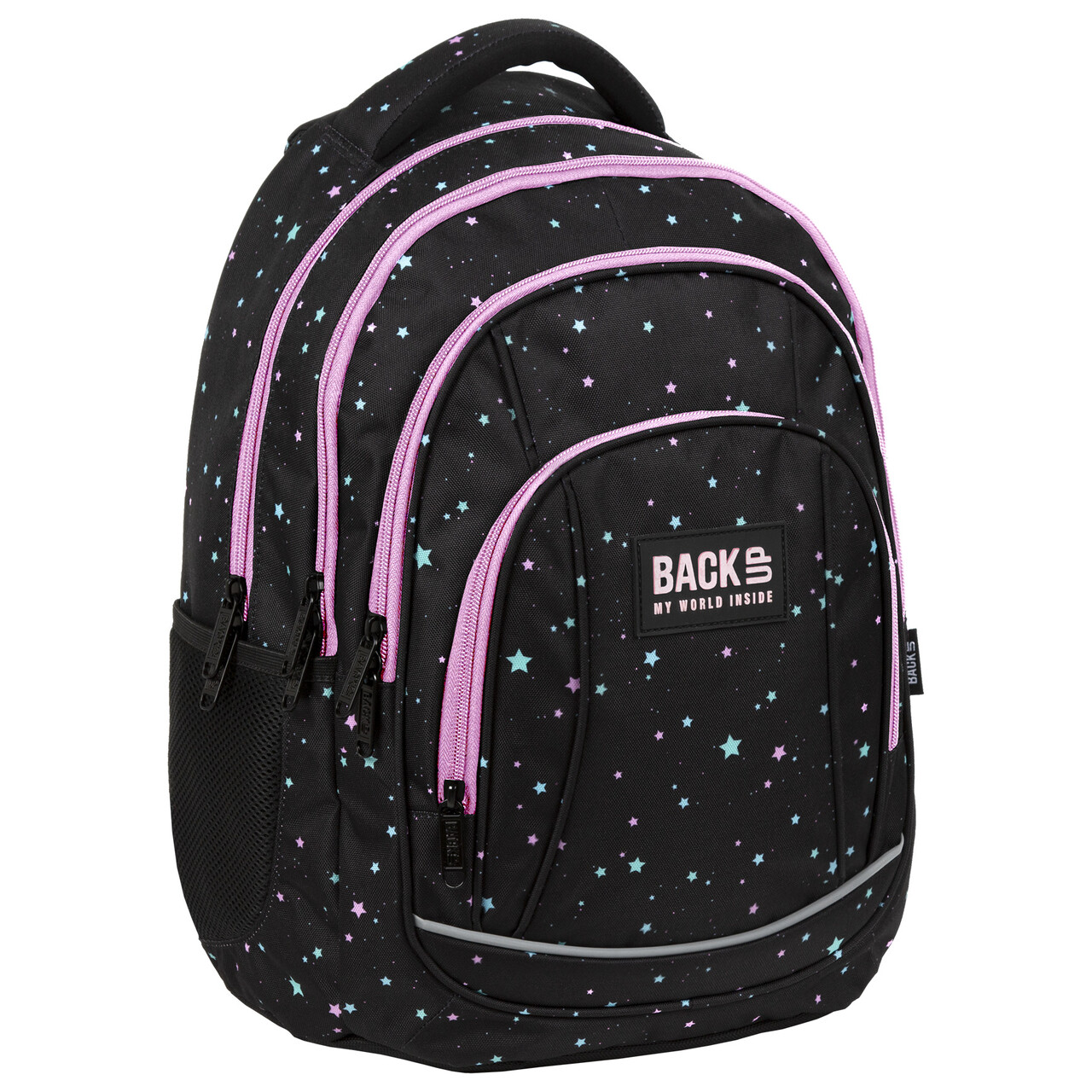 Czarny plecak w pastelowe gwiazdki różnej wielkości został uzupełniony różowym zamkiem, który nadał mu lekkości. To wzór dla niepoprawnych romantyczek, a możę wręcz przeciwnie osób twardo stąpających po ziemi, które lubią czasem pobujać w obłokach. Wnętrze: - 4 duże komory - 2 boczne kieszenie na napój - w pierwszej komorze kieszenie na laptopa i tablet - w trzeciej komorze praktyczna kieszonka na zamek, poręczny organizer z zamykaną kieszonką z siateczki, miejscem na długopisy oraz uchwytem na klucze - pasek mostka - dno plecaka wykonane ze wzmocnionej tkaniny - miękkie, profilowane szelki - wygodny uchwyt do przenoszenia plecaka i dodatkowy uchwyt do powieszenia - ergonomiczne i profilowane, usztywnione plecy z pianki zapewniającej wentylację - lamówka z odblaskiem na froncie plecaka oraz na szelkach - rozmiar: 42x30x20 cm - waga:880g"