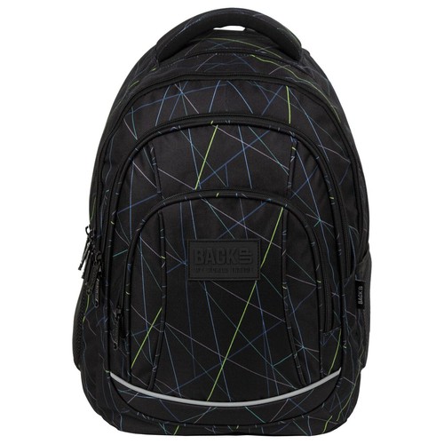 Zielone i niebieskie wiązki lasera przecinają ciemne tło. Nazwa wzoru: laser. Wnętrze: - 4 duże komory - 2 boczne kieszenie na napój - w pierwszej komorze kieszenie na laptopa i tablet - w trzeciej komorze praktyczna kieszonka na zamek, poręczny organizer z zamykaną kieszonką z siateczki, miejscem na długopisy oraz uchwytem na klucze - pasek mostka - dno plecaka wykonane ze wzmocnionej tkaniny - miękkie, profilowane szelki - wygodny uchwyt do przenoszenia plecaka i dodatkowy uchwyt do powieszenia - ergonomiczne i profilowane, usztywnione plecy z pianki zapewniającej wentylację - lamówka z odblaskiem na froncie plecaka oraz na szelkach - rozmiar: 42x30x20 cm - waga:880g