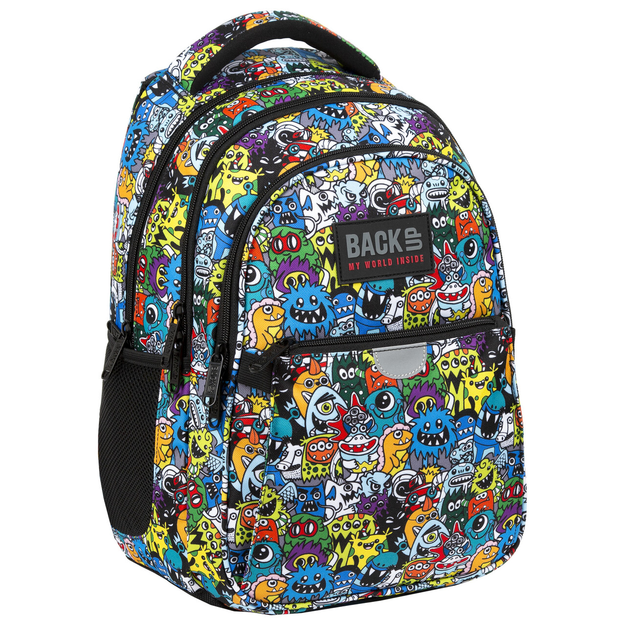 Bardzo wesoły plecak w kolorowe kreskówki. Z takim plecakiem już nikt nie musi bać się potworów. Rozmiar dedykowany uczniom pierwszej klasy. Nazwa wzoru: story Wnętrze: - 3 komory - przednia poszerzana kieszonka na zamek - 2 boczne kieszenie na bidon - w pierwszej komorze 2 dodatkowe kieszenie - w przedniej kieszeni poręczny organizer dodatkową z kieszonką na zamek i uchwytem na klucze - miękkie szelki z regulacją długości - wygodny uchwyt do przenoszenia plecaka oraz dodatkowy uchwyt do powieszenia - dno plecaka wykonane ze wzmocnionej tkaniny - emelenty odblaskowe z przodu i z tyłu plecaka - rozmiar dedykowany uczniom od 1 klasy Rozmiar: 39x26x20 cm - waga: 755g