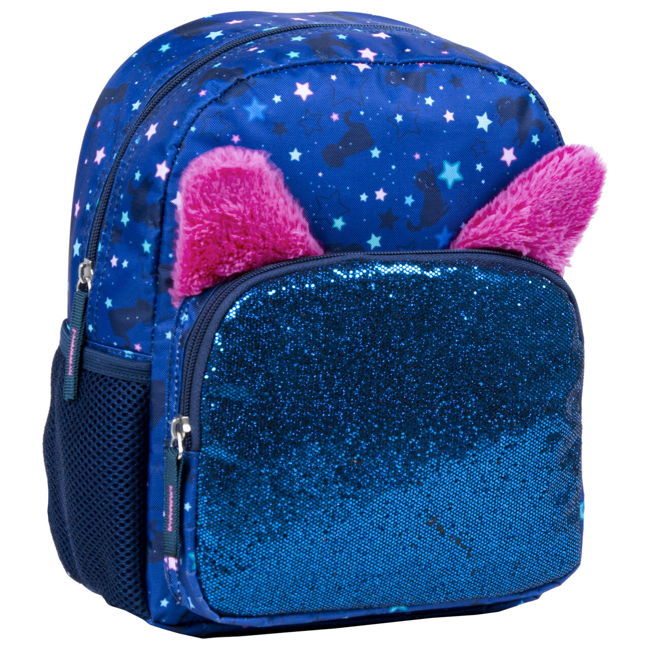 Urocze gwiazdki, brokatowa kieszeń i dodatkowo śliczne, różowe uszka a wszystko utrzymane w tonacji granatu i ciemnego różu. Wnętrze: Plecak jednokomorowy z - przednia kieszeń zapinana na zamek - frontowy panel wykończony został brokatową tkaniną - niesamowity wygląd plecaka podkreślają dodatkowe gadżety w postaci rogu jednorożca lub pluszowych uszu w zależności od modelu - boczna kieszeń na bidon - uchwyt do przenoszenia. - rozmiar: 27x23x14 cm - waga - 220 g