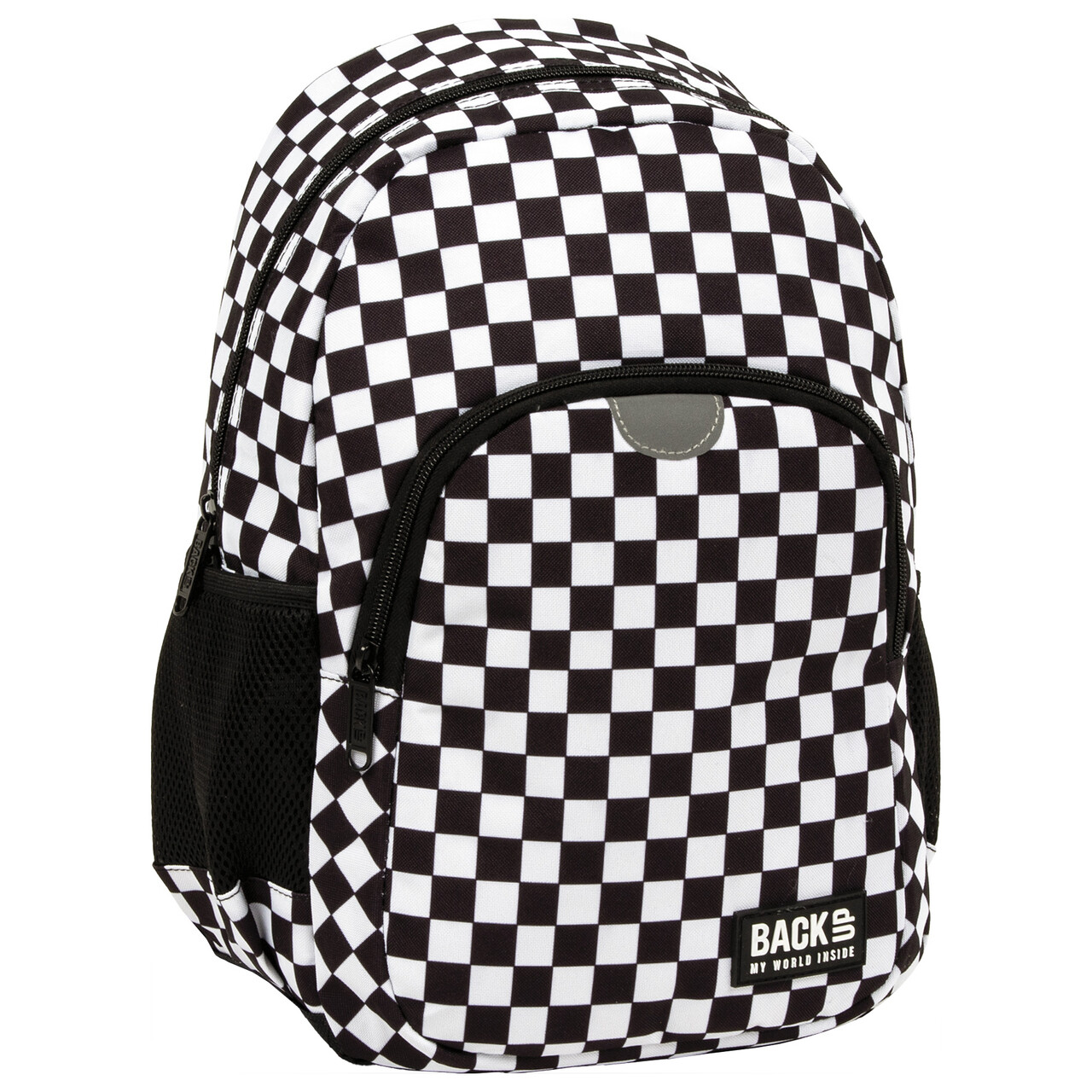 Klasyka i styl, czyli ponadczasowa, biało-czarna szachownica, którą pokochali nie tylko skaterzy. Uniwersalny plecak o nienachalnym, streetstyle'owym wzorze przypadnie do gustu fanom minimalizmu. Młodzieżowy motyw, który dopasuje się do każdej stylizacji, jednocześnie przykuwając wzrok. Sprawdzi się zarówno jako plecak na wycieczkę jak i do przedszkola, lub do zerówki. Plecak BackUP posiada: - 2 komory - 2 boczne kieszenie na bidon - ergonomiczne szelki z regulacją długości - pasek mostka - usztywniane plecy - wygodny uchwyt do przenoszenia i powieszenia plecaka - dno wykonane ze wzmocnionej tkaniny - elementy odblaskowe z przodu i z tyłu plecaka - rozmiar dedykowany uczniom klas 0 i 1 34x26x14 cm - waga 270 g