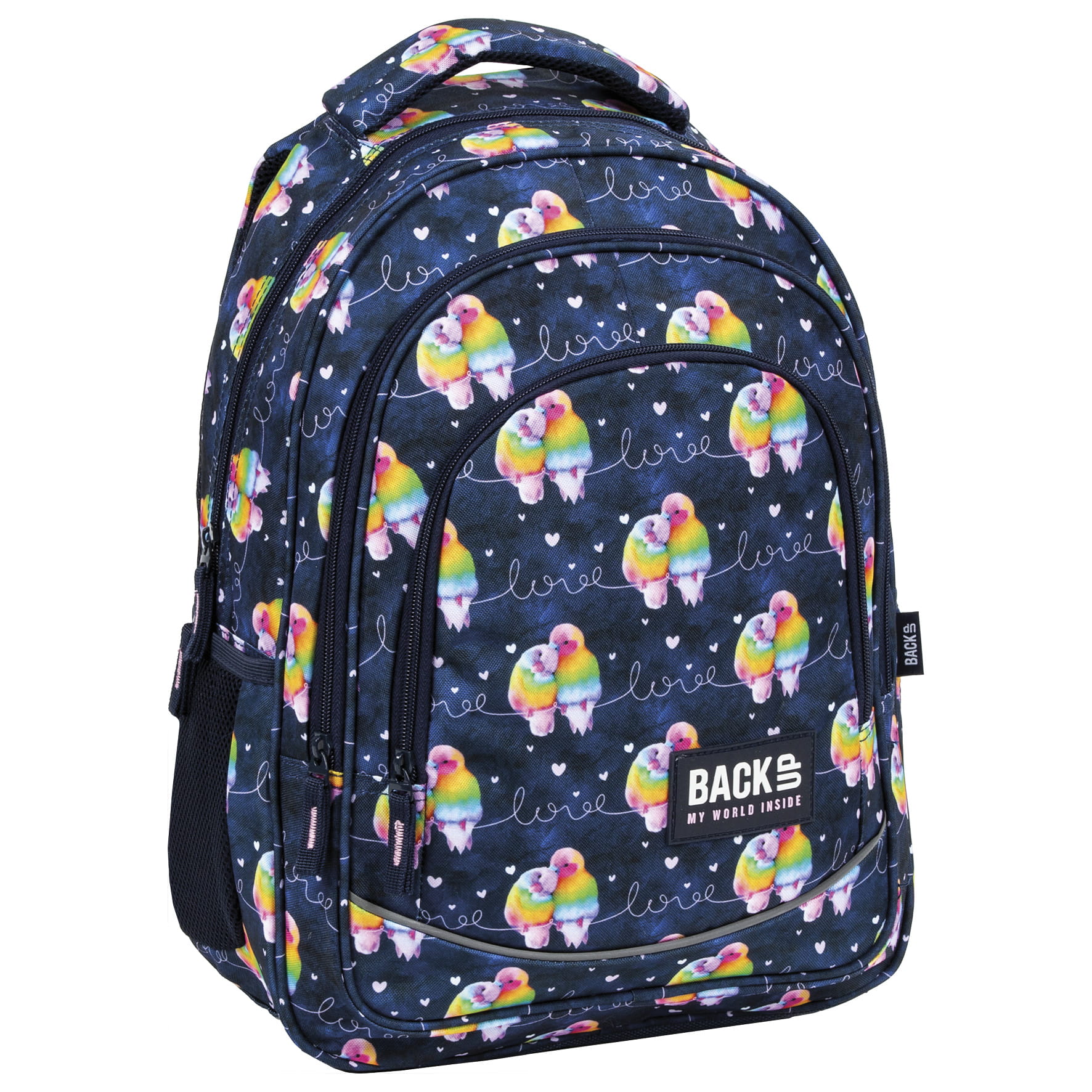 Wielobarwne papużki, które łączy silna, miłosna więź, tulące się na tle głębi granatu. Romantyczny i kolorowy - taki właśnie jest plecak BackUP z kolekcji Love! Połączenie intensywnych barw zieleni, fioletu i granatu tworzy niezwykłą, radosną kompozycję. To plecak dla dziewczynki, którą miłość inspiruje do wszystkiego co piękne! Plecak BackUP posiada: - 3 komory - 2 boczne kieszenie na bidon - w pierwszej komorze kieszenie do przechowywania laptopa i tabletu - w przedniej komorze kieszonkę z siateczki na zamek błyskawiczny, uchwyt na klucze, przegródki na długopisy, legitymację oraz większą kieszeń na chusteczki, płyn antybakteryjny, czy gumy do żucia - ergonomiczne, usztywnione plecy wyprofilowane oddychającą pianką - miękkie, profilowane szelki z możliwością regulacji - czarne dno wykonane ze wzmocnionej tkaniny - wzmocnioną rączkę do przenoszenia oraz dodatkowy uchwyt do powieszenia plecaka - odblaski na froncie oraz na szelkach - rozmiar 42x30x20 cm - nazwa kolekcji: Love