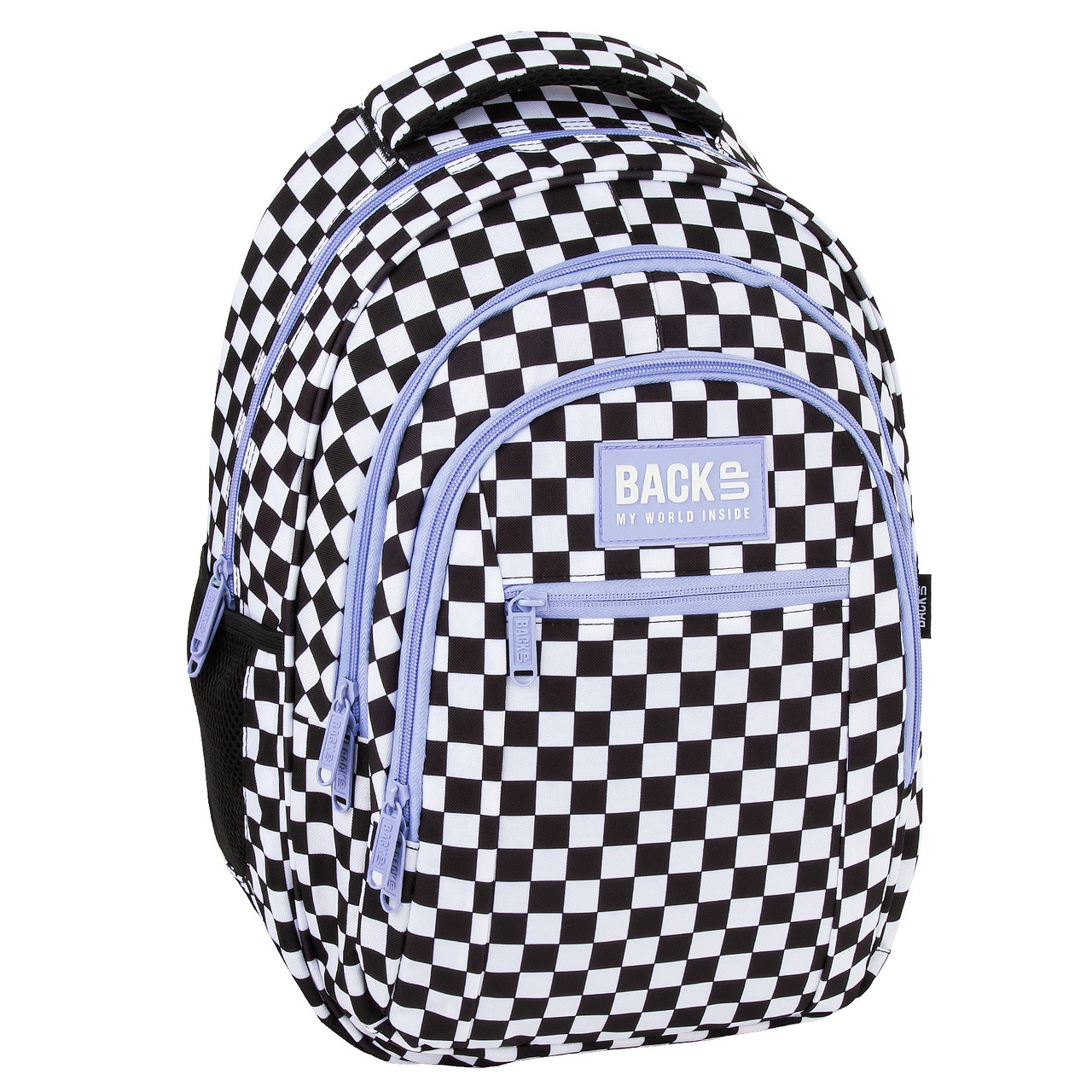 Klasyczna czarno-biała kratka przełamana fioletem suwaków i zamków. Znany i uwielbiany motyw szachownicy w zupełnie nowej, świeżej odsłonie. Ten młodzieżowy plecak jak żaden inny wpasowuje się w panujące trendy. Ponadczasowy styl, który uzupełni każdą szkolna stylizację. Plecak BackUP posiada: - 3 duże komory - 2 boczne kieszenie na bidon - na froncie plecaka kieszeń na zamek, idealna na drobiazgi - w pierwszej komorze kieszenie do przechowywania laptopa i tabletu - w drugiej komorze kieszonkę z siateczki na zamek błyskawiczny, uchwyt na klucze, przegródki na długopisy, legitymację oraz większą kieszeń na chusteczki, płyn antybakteryjny, czy gumy do żucia - ergonomiczne, usztywnione plecy wyprofilowane oddychającą pianką - miękkie, profilowane szelki z możliwością regulacji - regulowany pasek mostka - czarne dno wykonane ze wzmocnionej tkaniny - wzmocnioną rączkę do przenoszenia oraz dodatkowy uchwyt do powieszenia plecaka - odblaski na szelkach - rozmiar 42x30x20 cm Nazwa kolekcji: Szachownica F