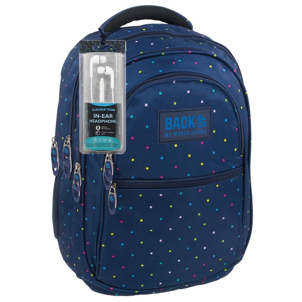 Szkolny plecak BackUP model B gdzie kolorowe kosteczki ożywiają ciemny granat nadając całości niepowtarzalnego charakteru. W zestawie słuchawki - gratis. Wyposażenie: - 4 duże komory - 1 pojemna, przednia kieszeń - 2 boczne kieszenie na napój - w tylnej komorze kieszenie na laptopa i tablet - w trzeciej komorze wygodna kieszeń na zamek na drobiazgi - w przedniej komorze poręczny organizer z kieszonką na zamek oraz odczepianym uchwytem na klucze - wygodne, profilowane szelki - wygodny uchwyt do przenoszenia plecaka i dodatkowy uchwyt do powieszenia - ergonomiczne, usztywnione plecy wyprofilowane oddychającą pianką - dyskretny odblask na szelkach