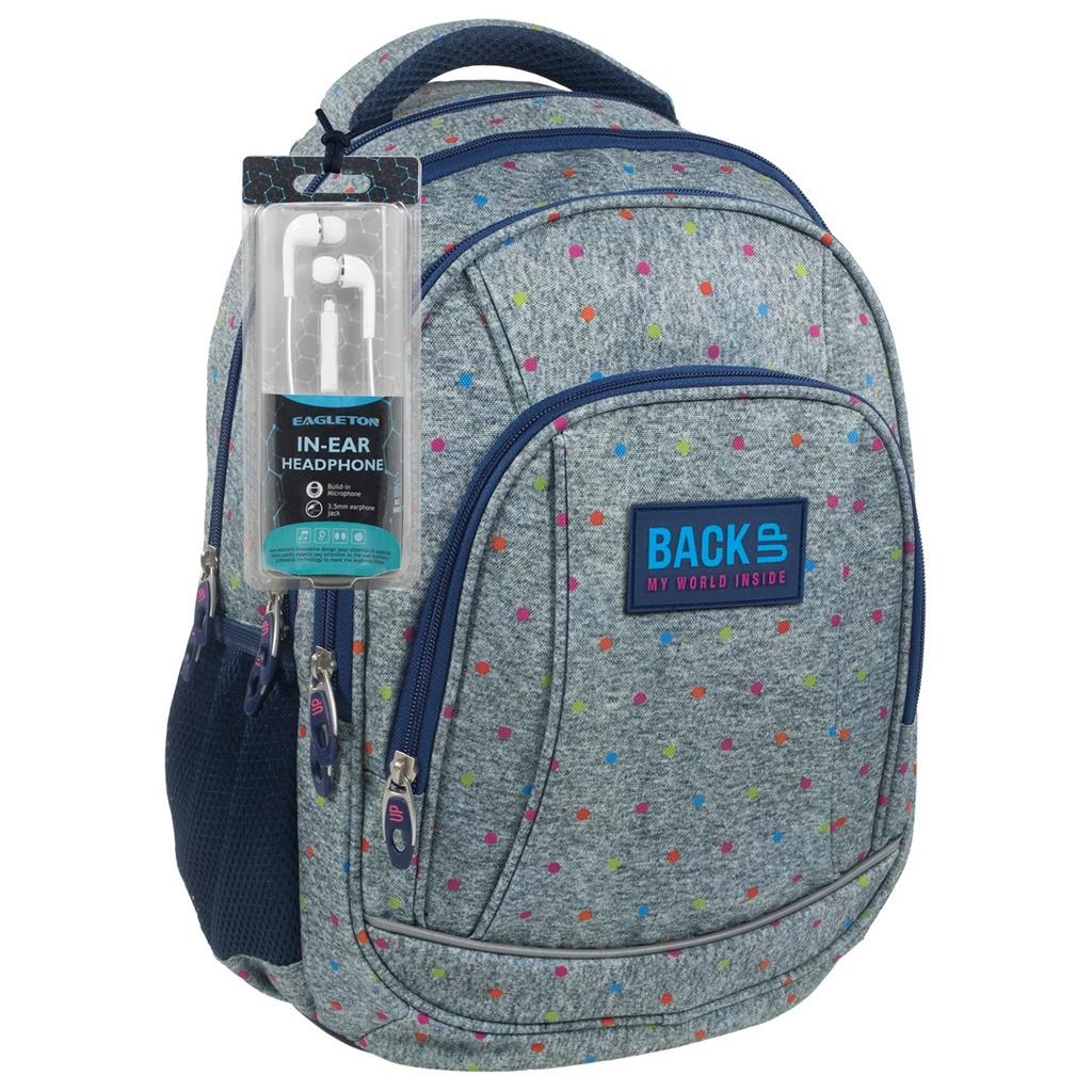 Szkolny plecak BackUP model A niepowtarzalny wzór z tłem w kolorze szary melanż wykończony kolorowymi kropkami. W zestawie słuchawki - gratis. Wyposażenie: - 4 duże komory - 2 boczne kieszenie na napój - w tylnej komorze kieszenie na laptopa i tablet - w trzeciej komorze praktyczna kieszeń na zamek na drobiazgi - w przedniej komorze poręczny organizer z kieszonką na zamek oraz odczepianym uchwytem na klucze - dno plecaka wykonane ze wzmocnionej tkaniny - miękkie, profilowane szelki - wygodny uchwyt do przenoszenia plecaka i dodatkowy uchwyt do powieszenia - ergonomiczne, usztywnione plecy wyprofilowane oddychającą pianką - dyskretny odblask w dole plecaka oraz na szelkach - rozmiar: 42x30x20 cm BackUP - My world inside Marka młodzieżowa BackUP powstała w oparciu o długoletnie doświadczenie branżowe swojego producenta firmy Derform. W najnowszej kolekcji nawiązano do najmodniejszych światowych trendów odpowiadając tym samym na potrzeby użytkowników. Plecaki tej marki charakteryzują się dbałością o każdy szczegół i troską o zdrowie użytkowników. Uzupełnieniem kolekcji plecaków jest szeroka gama piórników, worków na plecy, kosmetyczkę, toreb fitness oraz toreb sportowych.